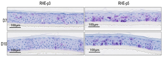 RHEs derived from NHEKs at p3 or p5, cultured for 5 or 10 days, and stained for p16Ink4a—a specific biomarker for senescence and aging—demonstrated a notable increase in p16Ink4a-positive keratinocytes and accompanying epidermal thinning as the NHEK passages increased. The proportion of senescent keratinocytes in RHEs from NHEK at p5 exhibited a 234% (p < 0.001) increase compared to those from p3, indicating a significant rise in senescence with the advancement of cell passages (Figure 3). In RHE-p7, p16Ink4a-positive keratinocytes are mainly detected in the basal layer.