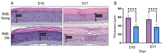 After characterizing our model by using different passage numbers of keratinocytes to simulate the aging process in RHEs through senescent cell accumulation, we subsequently analyzed RHEs reconstructed from NHEK obtained from both young (RHE-Young) and aged (RHE-Old) donors. In both cases, the RHEs exhibited complete stratification with different basal and suprabasal layers, as well as the formation of a cornified layer (Figure 4). However, RHEs reconstructed with aged keratinocytes demonstrated significant thinning compared to those reconstructed with young cells, either after 10 or 17 days of culture.