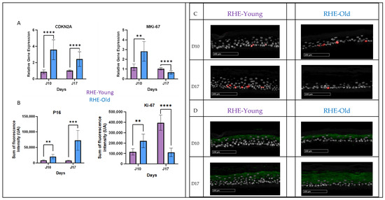 Analysis of proliferation and senescence markers in reconstructed human epidermis (RHE) from young (RHE-Young) and aged (RHE-Old) normal human epidermal keratinocytes (NHEK) after 10 days (J10) and 17 days (J17) of culture. (A) RT-qPCR analysis of the relative expression of CDKN2A (left) and MKI67 (right) genes in RHE-Young and RHE-Old at J10 and J17 of culture. (B) Protein-level analysis showing the quantification of p16 (left) and Ki67 (right) protein expression in RHE-Young and RHE-Old at J10 and J17 of culture (** p < 0.01; *** p < 0.001; **** p < 0.0001). (C) RHE section, Ki67 (red) DNA labels (grey) (D) RHE section, P16 (green) DNA labels (Grey). IMF analysis of proliferation (A) and senescence (B) markers in reconstructed human epidermis (RHE) from young (RHE-Young) and aged (RHE-Old) normal human epidermal keratinocytes (NHEKs) after 10 days (J10) and 17 days (J17) of culture.