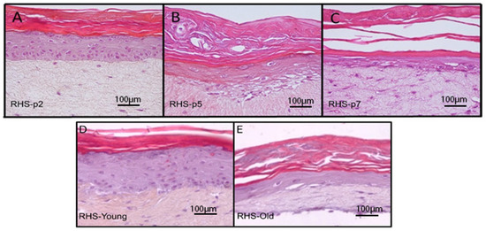 Morphological analysis of reconstructed human skin (RHS) from normal human epidermal keratinocytes (NHEKs) at different passages (A–C) and from young and aged donors (D,E). (A–C) Histological sections of RHS with NHEKs at various passages: (A) RHS-p2 with normal morphology, (B) RHS-p5 with altered morphology and parakeratosis, and (C) RHS-p7 with significant disorganization and loss of integrity. (D,E) Histological sections of RHS with NHEKs from young and aged donors: (D) RHS-Young with well-structured epidermis, and (E) RHS-Old with thinned epidermis and disorganization.