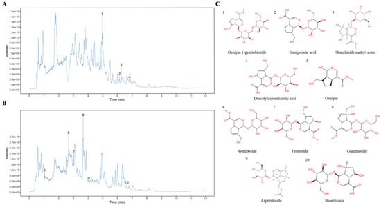 The total positive and negative ion chromatograms of GFE are shown in Figure 1A,B. Ten iridoids were identified in GFE (Figure 1C and Table S1): (1) genipin 1-gentiobioside, (2) geniposidic acid, (3) shanzhiside methyl ester, (4) deacetylasperulosidic acid, (5) genipin, (6) geniposide, (7) feretoside, (8) gardenoside, (9) asperuloside, and (10) shanzhiside.