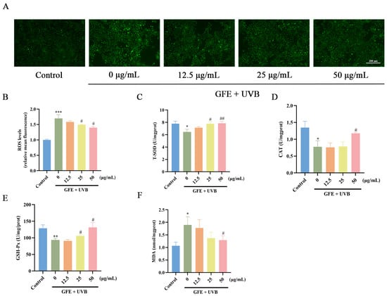 The effects of GFE on the oxidative stress in HaCaT cells. (A,B) The levels of intercellular ROS were stained with DCFH-DA, photographed by fluorescence microscopy, and measured under a fluorescence microplate reader; scale bar = 50 μm. The levels of (C) T-SOD, (D) CAT, (E) GSH-Px, and (F) MDA were determined by specialized test kits (mean ± SD, n = 3). * p < 0.05, ** p < 0.01, and *** p < 0.001 vs. the control; # p < 0.05 and ## p < 0.01 vs. UVB.