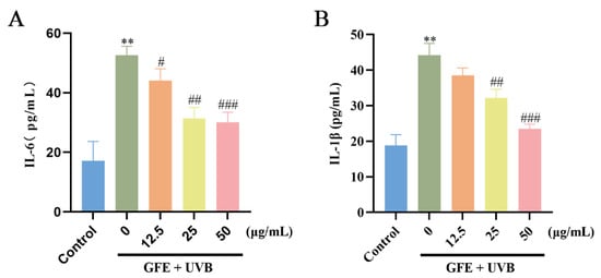 The effects of GFE on inflammation in HaCaT cells. The contents of (A) IL-6 and (B) IL-1β were quantified by ELISA (mean ± SD, n = 3). ** p < 0.01 vs. the control; # p < 0.05, ## p < 0.01, and ### p < 0.001 vs. UVB.