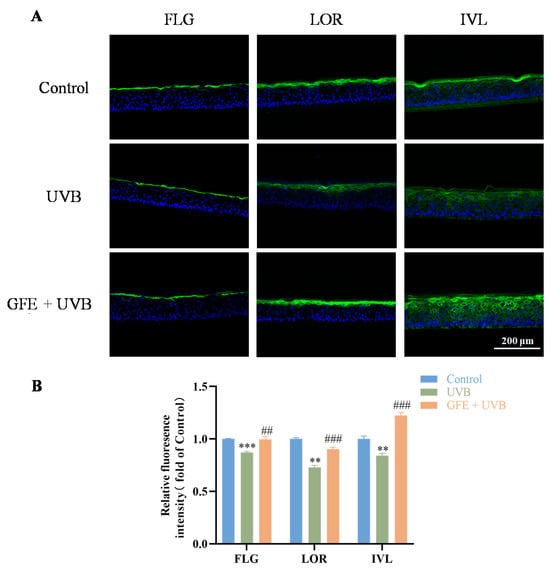 Filaggrin (FLG), loricrin (LOR), and involucrin (IVL) are the important barrier proteins that regulate skin permeability and prevent water evaporation []. Our research showed that UVB exposure diminished barrier function by downgrading the expression of FLG, IVL, and LOR in the three-dimensional epidermal models. After GFE treatment, the barrier functions of the skin models were restored and the expression of barrier-related proteins (FLG, IVL, and LOR) was increased (Figure 4).