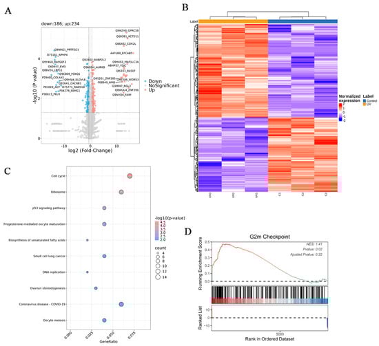 Proteomic analysis of the control and UV groups. (A) DEPs between the control group and UV group shown in a volcano plot; (B) cluster analysis of DEPs between the control group and UV group shown in a heatmap; (C) KEGG analysis between the control group and UV group; (D) GSEA between the control group and UV group.