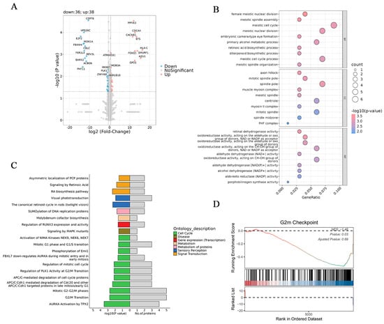 Between the UV-GFE and UV groups, 38 DEPs were upregulated and 36 DEPs were downregulated (Figure 6A). Gene Ontology (GO) analysis (Figure 6B) showed that GFE treatment exerted a significant impact on meiotic nuclear division, meiotic spindle assembly, and the meiotic cell cycle in the biological process (BP) category. Cell components (CCs) that were influenced mostly included axon hillocks, mitotic spindle poles, and spindle poles. In the molecular function (MF) category, the functions of retinal dehydrogenase activity, oxidoreductase activity, and aldehyde dehydrogenase (NAD+) activity were mainly altered. Next, reactome enrichment analysis revealed that the DEPs were enriched in the cell cycle (Figure 6C). Interestingly, the GESA results indicated that GFE treatment significantly downregulated the G2/M checkpoint, which was upregulated by UVB treatment (Figure 6D).