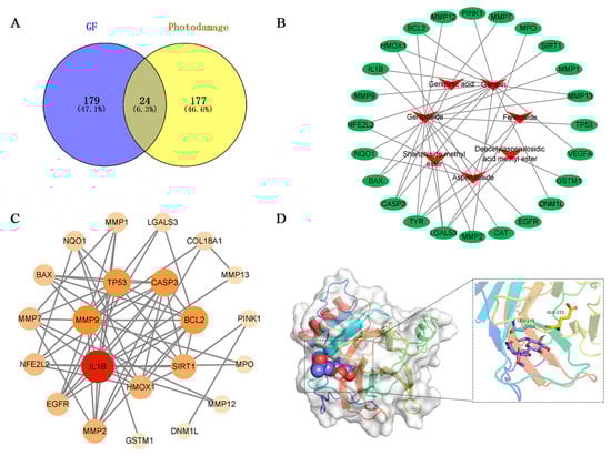 After removing duplicates, a total of 201 genes associated with photodamage were collected from the GeneCards, OMIM, and CTD databases. Additionally, 203 genes related to iridoids in GFE were predicted using SwissTargetPrediction and the CTD database. A Venn diagram showed that 24 targets were intersected between GFE and photodamage (Figure 7A).