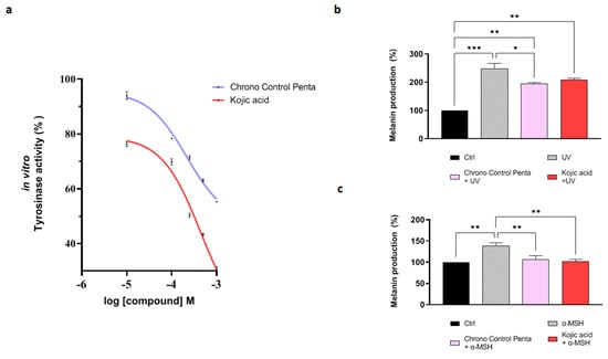 Melanocytes were plated and incubated for 24 h then exposed to UV irradiation or treated with α-MSH to induce melanogenesis. After 24 h, they were treated with Chrono Control Penta or Kojic acid and incubated for another 24 h. For the quantification of cellular melanin, the method of Chan et al. was followed with slight modifications [13]. More details are reported in Supplementary Materials Section S2.5.