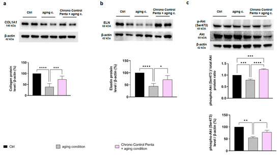 The results of our study also indicate that Chrono Control Penta, tested at 50 µM, promotes the production of collagen and elastin in aged human dermal fibroblasts; moreover, it positively regulates the secretion of collagen and elastin and the secretion of metalloproteinases MMP-2 and MMP-9, thus contributing to the stability of the extracellular matrix (ECM), supporting its function. In more detail, the results presented in Figure 3c demonstrate that Chrono Control Penta promotes reactivation of the Akt signaling pathway, which plays a crucial role in ECM proteins synthesis [15,16]. Akt, also known as protein kinase B, is activated by phosphorylation at Ser473, and this modification is essential for its full enzymatic activity [26]. Specifically, in dermal fibroblasts, the active phospho-Akt enhances transcriptional and translational processes that lead to the increased production of structural proteins such as collagen and elastin. Moreover, studies have shown that the suppression of PI3K/Akt signaling contributes to the senescent phenotype in skin-derived precursor cells. This suggests that the PI3K/Akt pathway is crucial for preventing the onset of cellular aging [27].