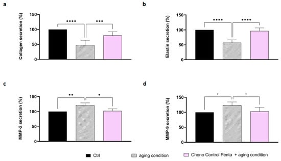 To further study the potential effects of Chrono Control Penta on the stability of extracellular matrix (ECM), ELISA assays were conducted on aged cells. Specifically, as indicated in Figure 4, the aging condition promoted the reduction in collagen and elastin secretion by 52.2 ± 16.20% and 55.91 ± 11.60%, respectively (Figure 4a,b), while an increase in MMP-2 and MMP-9 secretion up to 120.9 ± 7.95% and 123.3 ± 11.06%, respectively, was observed. (Figure 4c,d). Effectively, Chrono Control Penta improves the aging-reduced effects, promoting collagen secretion up to 79.49 ± 12.97% and elastin secretion up to 71.11 ± 17.57%, in the presence of aging condition (Figure 4a,b). Notably, Chrono Control Penta can augment collagen and elastin secretion by 66.29 ± 27.13% and 69.74 ± 18.20%, respectively, compared to the aging condition.