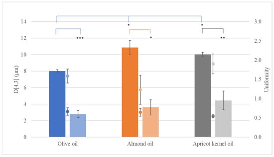The volume-weighted mean diameter (D[4,3], bar) and uniformity (dot) of the droplets of conventional emulsions (CEs) containing beeswax (dark hue) or cocoa butter (light hue) in combination with olive oil (blue), almond oil (orange), or apricot kernel oil (grey). *: p < 0.05, **: p < 0.01, ***: p < 0.005.