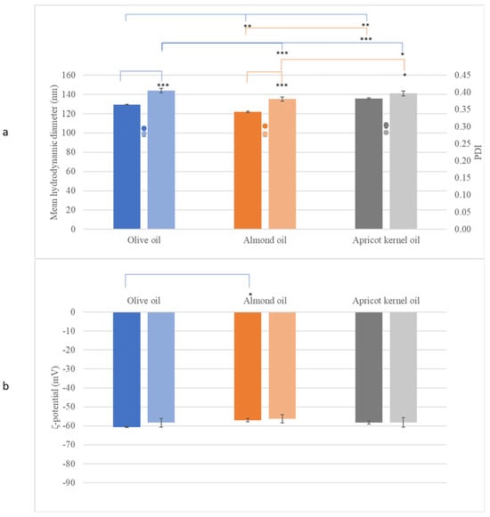 The characterization of the dispersed phase of the NEs containing beeswax (dark hue) or cocoa butter (light hue) in combination with olive oil, almond oil, or apricot kernel oil, showing (a) the mean hydrodynamic diameter (bar), the PDI (dot), and (b) the ζ-potential. *: p < 0.05, **: p < 0.01, ***: p < 0.005.
