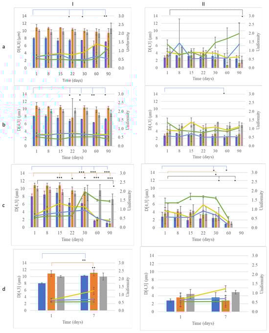 Monitoring of size (D[4,3], bar) and uniformity (line) of conventional emulsions (CEs) with (I) beeswax or (II) cocoa butter and olive oil (blue bar, blue line), almond oil (orange, yellow line), apricot oil (gray bar, green line) over time during storage at (a) 4 °C, (b) 25 °C, (c) 45 °C, and (d) accelerating aging. *: p < 0.05, **: p < 0.01, ***: p < 0.005.