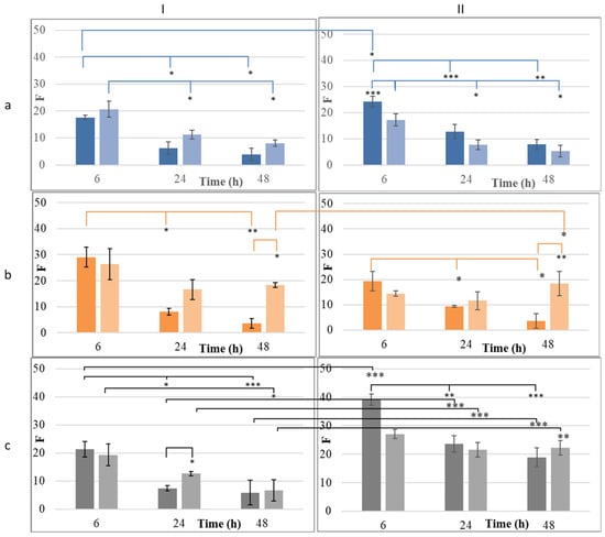 The occlusive index (F) of conventional emulsions (CE, dark hue) and their corresponding nanoemulsions (NE, light hue) prepared by combining (I) beeswax or (II) cocoa butter with (a) olive oil, (b) almond oil, or (c) apricot kernel oil. *: p < 0.05, **: p < 0.01, ***: p < 0.005.