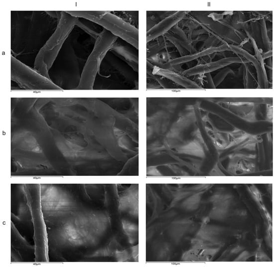 SEM images showing (a) filter paper without lipids, (b) conventional emulsion with cocoa butter–apricot kernel oil, and with (eCAPR) (c) cocoa butter–apricot kernel oil nanoemulsion (nCAPR) at (I) 1200× and (II) 550×.