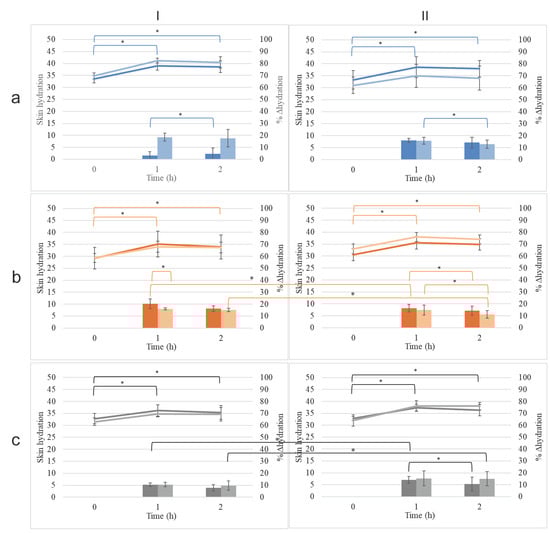 The skin hydration effect of conventional emulsions (CE, dark hue) and their corresponding nanoemulsions (NE, light hue) prepared by combining (I) beeswax or (II) cocoa butter with (a) olive oil, (b) almond oil, and (c) apricot kernel oil. * p < 0.05.