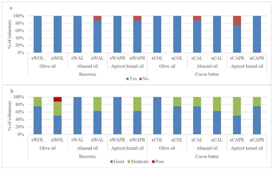 The assessment of skin texture feel revealed differences between formulations (Figure 9b). For emulsions containing olive oil, eWOL was rated as “good” by 75% of volunteers, while only 50% rated nWOL as “good”, with the remaining participants rating it as “moderate” (37.5%) or “poor” (12.5%). Among cocoa butter-based formulations, eCOL received a 100% “good” rating, while nCOL was rated as “good” by 75% and “moderate” by 25% of volunteers.