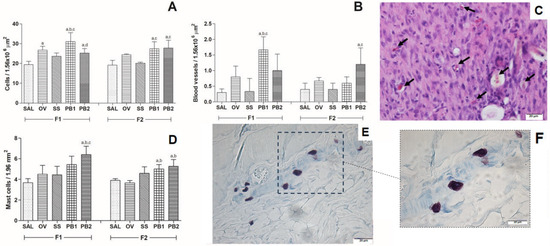 Proportion of cells (A), blood vessels (B,C), and mast cells (D–F) in the scar tissue of rats treated with B. oleracea extract. (E,F): photomicrograph of mast cells after treatment with B. oleracea extract (20%) (toluidine blue, E (20 µm = 40× magnification) and F (10 µm = 100× magnification)). F1, and F2 = scar tissue after four and eight days, respectively. (C,E,F) were obtained in F2 (eight days). SAL: saline solution 0.9%; OV: ointment vehicle; SS: silver sulfadiazine, PB1: B. oleracea extract (10%); and PB2: B. oleracea extract (20%). Arrows show the blood. Data represented as mean ± standard deviation of the mean. a, b, c, d represent the statistical difference between treatments, SAL, OV, SS, and PB1, respectively (p < 0.05) (Student–Newman–Keuls test).