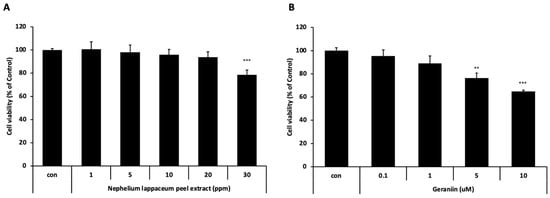 We measured a cell viability assay to evaluate the cytotoxicity of Nephelium lappaceum peel extract and geraniin on HaCaT cells. When these substances were treated on HaCaT cells for 24 h, Nephelium lappaceum peel extract reduced cell viability by approximately 78% at a concentration of 30 ppm (Figure 1A). Geraniin reduced cell viability by 76% at 5 μM and 64% at 10 μM (Figure 1B). Both substances showed a dose-dependent decrease in cell viability. Based on these results, the final concentrations for further experiments were set at 20 ppm for Nephelium lappaceum peel extract and 1 μM for geraniin.