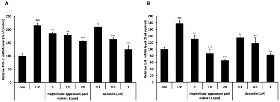 UV-B has a wavelength of 280–320 nm and is primarily absorbed by the epidermis, causing DNA damage and oxidative stress, which subsequently leads to inflammation [38]. This process results in the release of cytokines such as TNF-α, IL-6, and IL-8. Therefore, we investigated the extent of cytokine induction when HaCaT cells were exposed to UV-B. HaCaT cells were treated with 50 mJ of UV-B for 24 h, resulting in the induction of TNF-α, IL-6, and IL-8 (Figure 3). Nephelium lappaceum peel extract and geraniin dose-dependently inhibited TNF-α after 3 h of UV-B pretreatment (Figure 3A). For IL-8, Nephelium lappaceum peel extract showed a greater inhibitory effect than geraniin (Figure 3B). These results suggest that Nephelium lappaceum peel extract may have anti-inflammatory potential comparable to or greater than that of geraniin.