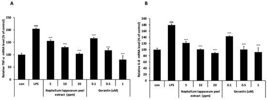 HaCaT cells were treated with LPS and the release of TNF-α and IL-8 was determined by q-RT PCR. (A) LPS was treated 3 h before treatment with Nephelium lappaceum peel extract and geraniin, and TNF-α release was determined by 24 h treatment with 5, 10, and 20 ppm of Nephelium lappaceum peel extract and 0.1, 0.5, 1 μM of geraniin. Both substances decreased in a dose-dependent manner. (B) The release of IL-8 was determined by the same treatment. The results showed a dose-dependent decrease, similar to TNF-α. Values are the means SD from three replicates (n = 3). Data were analyzed with t-test. *** p < 0.001 compared with LPS-induced. ### p < 0.001 compared with the control.