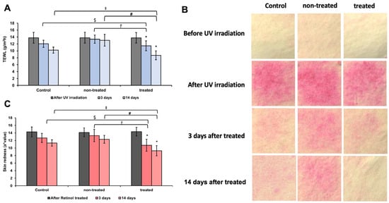 Retinol (1%) was applied to the inner forearm of the participants’ left or right arms in three designated areas (control, non-treated, and treated). A 20 μL aliquot of 1% retinol was dispensed into a chamber and occlusively applied for 24 h. After 24 h, the chamber was removed, and the application site was gently cleansed with lukewarm water. After an additional 30 min, the presence or absence of skin damage was assessed under standardized lighting conditions. The retinol used in this study was provided by InvivoTech Co., Ltd. as a 15% retinol formulation and was used to induce skin damage. (A) TEWL was measured once at each test site on the study participants at each evaluation point (before and after stimulation, after 3 days of product use, and after 14 days of product use) using a Vapometer® (Delfin, Finland). (B) This is an image showing the measurement of TEWL in the control, non-treated, and treated areas of one of the participants. (C) Skin redness was assessed using ANTERA 3D® CS (miravex, Ireland). At each evaluation point, the participant’s test area was photographed, filters were applied, and a* values representing skin redness were analyzed. Values are the means SD from three replicates (n = 20). Data were analyzed with RM-ANOVA. * p < 0.05 compared with after retinol treated. † p < 0.05 compared with 3 days after treated on the non-treated group. # p < 0.05 compared with 14 days after treated on the non-treated group. $ p < 0.05 compared with 3 days after treated on control group. ‡ p < 0.05 compared with 14 days after treated on control group.