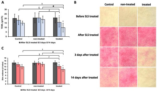 To induce a form of chemical damage using SLS, 20 μL of 1.5% SLS was dispensed into a chamber and applied to three sites (control, non-treated, treated) on the inner forearm (left or right) of the participants for 24 h. After 24 h, the patch was removed, and the site was gently washed with lukewarm water. After 30 min, the presence or absence of skin damage was assessed under standardized illumination conditions. (A) TEWL was measured once at each test site on the study participants at each evaluation point (before and after stimulation, after 3 days of product use, and after 14 days of product use) using a Vapometer® (Delfin, Finland). (B) This is an image showing the measurement of TEWL in the control, non-treated, and treated areas of one of the participants. (C) Skin redness was assessed using ANTERA 3D® CS (miravex, Ireland). At each evaluation point, the participant’s test area was photographed, filters were applied, and a* values representing skin redness were analyzed. Values are the means SD from three replicates (n = 20). Data were analyzed with RM-ANOVA. * p < 0.05 compared with after SLS treated. † p < 0.05 compared with 3 days after treated on the non-treated group. # p < 0.05 compared with 14 days after treated on the non-treated group. $ p < 0.05 compared with 3 days after treated on control group. ‡ p < 0.05 compared with 14 days after treated on control group.