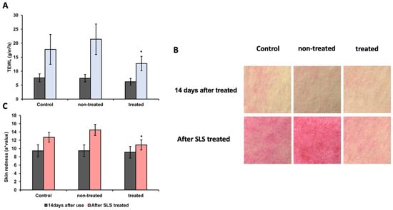 To protect against skin damage caused by SLS, 1.5% SLS was added dropwise in 20 μL to the chamber and applied for 24 h after 14 days of product use. (A) TEWL was measured once at each test site on the study participants at each evaluation point (14 days after treated, after SLS treated) using a Vapometer® (Delfin, Finland). (B) This is an image showing the measurement of TEWL in the control, non-treated, and treated areas of one of the participants. (C) Skin redness was assessed using ANTERA 3D® CS (miravex, Ireland). At each evaluation point, the participant’s test area was photographed, filters were applied, and a* values representing skin redness were analyzed. Values are the means SD from three replicates (n = 20). Data were analyzed with t-test. * p < 0.05 compared with 14 days after use.