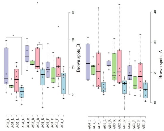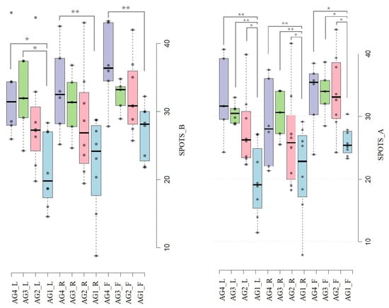 The evaluated score of spots highlighted the effectiveness of the treatment in terms of alleviating their appearance based on the age group and the scanned side of the face (Figure 2). Consequently, the differences between the age groups proved to be significant, mainly regarding AG1 and the others (p < 0.01). Regarding the front side of the face, the score of spots presented a slight reduction before (26.963 ± 4.014) and after (26.026 ± 2.385) the treatment in AG1 (Table 2).