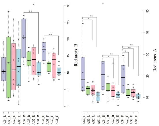 A damaged skin barrier may augment the susceptibility to several external factors which eventually intensify inflammatory reactions, including burning sensations, itchiness, and a feeling of tightness. The topical treatment on the front side of the face revealed insignificant differences between the age groups at the beginning of the treatment, except AG1 and AG4 (p < 0.01) which is to be expected to be due to the age gap (Figure 3; Table 2), with a small effect size (95% CI = −1.7885, 2.9576; Cohen’s d = 0.1345). Conversely, significant differences between AG4 and the other assemblages (AG1-AG3) have been regarded at the end of the treatment period. Thus, individuals in AG1 perceived discrepancies in the treatment (from 10.401 ± 1.672 to 10.459 ± 1.332), with several cases of diminished inflammatory sensations and redness visibility (e.g., RC02, and RC27); whereas others experienced a slight itchiness and an increased inflammatory response (e.g., RC01, RC 5, and RC 11). Improved outcomes were perceived from the second group, particularly in RC04, RC08, RC13, and RC20, with lessened unpleasant experiences and a visible improvement in red areas, as observed at the beginning (12.603 ± 3.94) and at the end (12.264 ± 2.291) of the treatment. Interestingly, the score in red areas presented similar values after 5 weeks in AG3, with no inflammatory responses reported by the individuals. Lastly, the majority in AG4 experienced a slight inflammatory response to the treatment and an increased visibility in redness with values from 16.568 ± 2.895 to 19.582 ± 7.308.