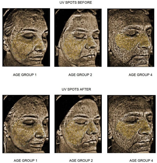 Risk indicators for oily or sensitive skin types relate to elevated melanin contents and a high proportion of perioral lines. These features may indicate that the skin is inadequately shielded from UV rays, which can result in more noticeable pigmentation and aging symptoms. Since augmented melanocyte activity may affect the skin’s defense towards external stimuli, these implications are linked to a degradation of the skin barrier’s normal functioning. According to scientific investigations, UV rays can impair the function of the skin’s barrier, cause inflammatory reactions in the skin, and trigger photoaging symptoms. Insignificant differences in terms of hyperpigmentation have been recorded in the front part of the face at the beginning and at the end of the treatment period, with a small effect size before and after the treatment (95% CI = −2.2581 3.7515; Cohen’s d = 0.1357) (Figure 6; Table 2). Conversely, improved skin complexion has been observed on the right side of the face with significant differences between close-related age groups 1 and 2 (Table 3), although a small effect size has been recorded (95% CI = −2.8422 4.6293; Cohen’s d = 0.1306).