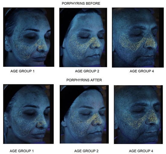 Porphyrins are organic compounds that play an essential role in cell biology, being structural components of vital molecules such as hemoglobin and chlorophyll. In the context of dermatology and skin health, porphyrins are produced by bacteria living on the surface of the skin, including Propionibacterium acnes, which contribute to acne formation. The analysis of porphyrins on the skin can provide valuable information about the state of the skin microbiome and help identify problems such as acne and other bacterial infections. Porphyrins provide a detailed assessment of skin health and the effectiveness of dermatologic treatments, as can be seen in Figure 8.