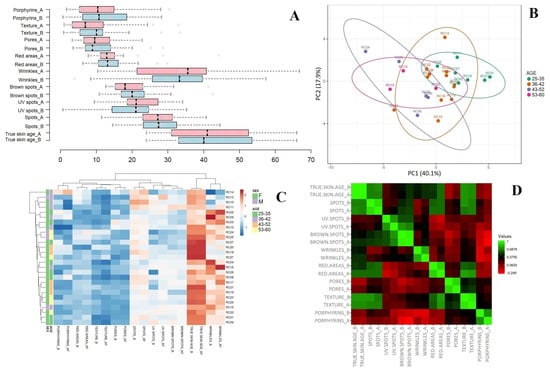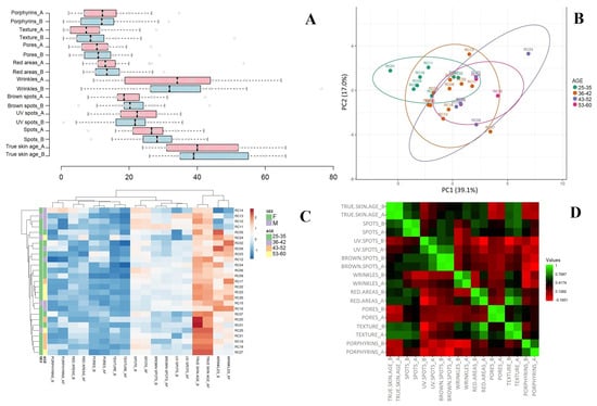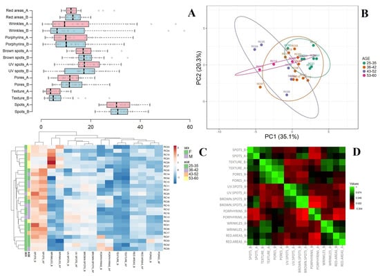The data are represented as means ± standard deviation. Box plots were generated using the ggplot2 package. Principal component analysis (PCA) was employed to visualize trends associated with the age groups and evaluated skin parameters according to each side of facial characteristics. Pearson’s correlation coefficients were constructed to evaluate the associations before and after 5 weeks of topical treatment with rosehip with the assessed skin parameters. Heatmaps and hierarchical cluster analysis (HCA) were created, employing the Euclidean distance to point out the resemblances and distinctions in the improvements or detrimental effects imposed by the topical application of rosehip oil. The packages used included cluster R, dendextend, and ggplot from the R database (version 2024.12.1).