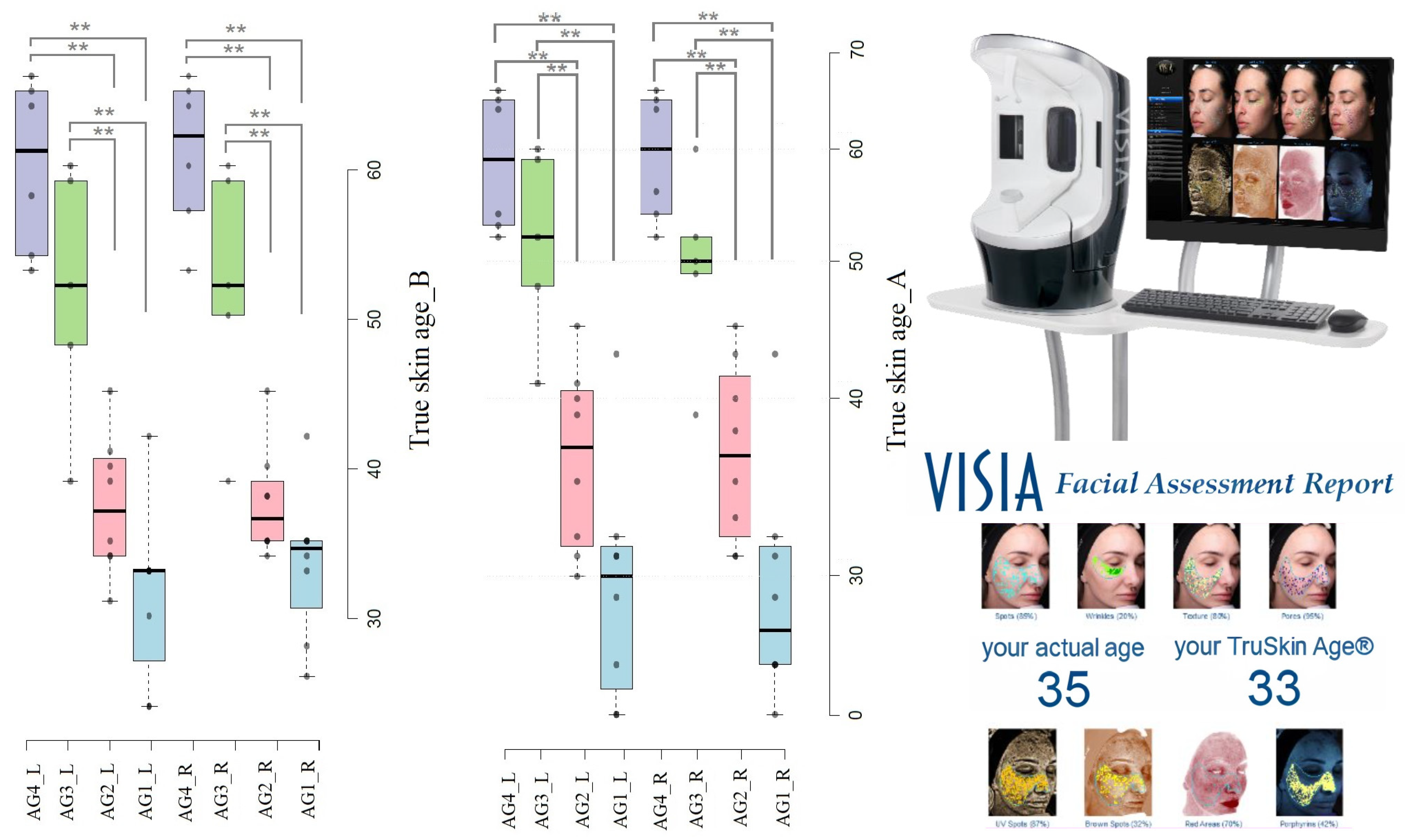 In recent years, the field of aging research has evolved significantly, bringing to the forefront advanced technologies that allow a detailed and accurate assessment of skin quality [1]. The VISIA system’s analysis of the skin provides insights into various parameters such as texture, wrinkles, blemishes, and pores, thus contributing to the understanding of the mechanisms of aging and the effectiveness of treatments. The VISIA analysis system, developed by Canfield Scientific Inc., provides assessments of skin conditions through multi-spectral and 3D imaging and allows the efficacy of applied treatments to be evaluated.