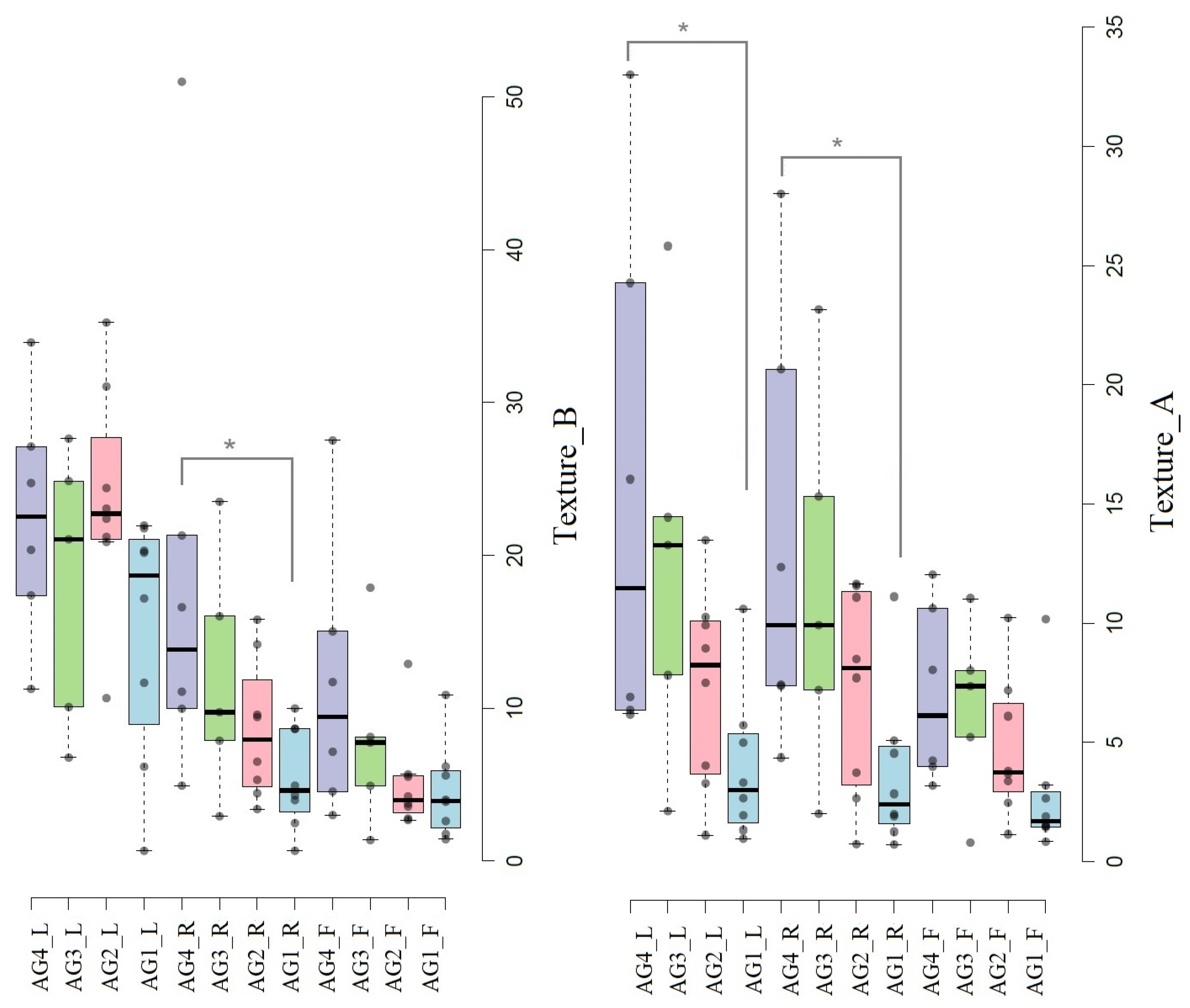 Dermatologists demonstrate a particular emphasis for evaluating the surface skin texture, as these measurements are intended for skin diagnostics and evaluating cosmetic efficiency or therapeutic treatments, as shown in Figure 7. The front facial side presents a general improvement in skin texture, which has been positively perceived by most of the volunteers, particularly females who stated that the rosehip oil gave a similar “glass skin” effect as other cosmeceutical products (Table 1). Thus, AG1 recorded a decreased score in texture from 4.542 ± 3.062 to 2.906 ± 3.031. An equivalent achievement has been detected in the following AG2 group, with a starting value of 5.138 ± 3.325 and a final value of 4.758 ± 2.92. In AG3, the skin complexion improved as observed by the decrease in scores from 8.008 ± 6.149 to 6.496 ± 3.797. Lastly, a visible and considerable effect has been attained in AG4 with a score from 11.492 ± 9.038 to 7.029 ± 3.764. Regarding the right side of the face, a similar positive tendency for texture enhancements has been regarded particularly in AG1 and AG4 (p < 0.05), with a small effect size (95% CI = −2.3804, 6.9803; Cohen’s d = 0.2684) (Table 2).