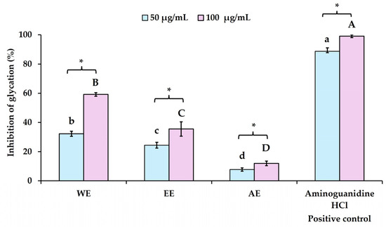 Figure 2). At the same concentration, EE and AE showed inhibition rates of 35.48 ± 4.90% and 11.94 ± 1.59%, respectively. A similar inhibition pattern was observed at a lower extract dosage (50 µg/mL), where WE, EE, and AE showed inhibition rates of 32.19 ± 1.80%, 24.48 ± 1.98%, and 7.72 ± 1.15%, respectively. Aminoguanidine HCl, used as a positive control at concentrations of 50 and 100 µg/mL, exhibited high inhibition of the glycation process, with rates of 88.75 ± 2.38% and 99.03 ± 0.94%, respectively, and an IC