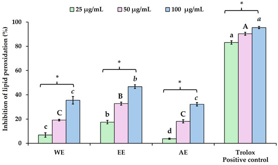 Figure 3. At the lowest concentration tested (25 µg/mL), WE, EE, and AE exhibited anti-lipid peroxidation activity of 6.89 ± 1.80%, 17.48 ± 1.46%, and 3.78 ± 0.55%, respectively. At 50 µg/mL, all crude extracts significantly increased their inhibitory activity, with WE, EE, and AE demonstrating 19.21 ± 0.65%, 32.75 ± 1.29%, and 18.12 ± 1.32%, respectively. At the highest concentration tested (100 µg/mL), moderate anti-lipid peroxidation activity was observed, with WE, EE, and AE inhibiting lipid peroxidation by 35.51 ± 3.16%, 46.74 ± 1.61%, and 32.23 ± 1.37%, respectively. Among the extracts, EE exhibited the highest activity compared to other extracts. These results demonstrate that all extracts showed concentration-dependent inhibitory effects in lipid peroxidation. Trolox, used as a positive control, showed strong anti-lipid peroxidation activity, with inhibition ranging from 83.16 ± 1.43% to 95.42 ± 0.91% at concentrations of 25 µg/mL to 100 µg/mL.