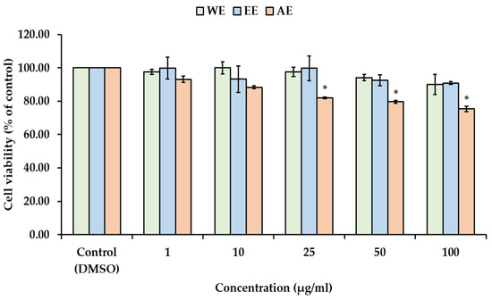 Figure 4. WE and EE exhibited non-cytotoxic doses at concentrations ranging from 1 to 100 µg/mL, whereas the