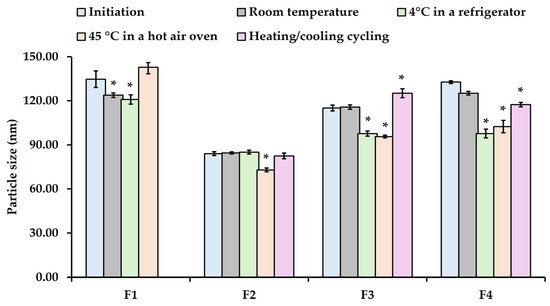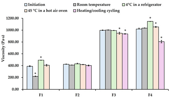 Figure 5). In contrast, the particle sizes of F3 and F4 formulations at room temperature were similar to the initial size on day 1, whereas F2 formulation remained stable under all conditions, except at 45 °C. However, the particle sizes of F3 and F4 formulations at 4 °C and 45 °C decreased significantly compared to the initial size on day 1. Under heating and cooling conditions, the particle size of F3 and F4 formulations increased substantially compared to day 1. Additionally, phase separation was noted in F1 after the third heating/cooling cycle. Correspondingly, the viscosity of F1 decreased significantly, even when stored at room temperature. The viscosity of F4, however, increased significantly when stored at 4 °C and 45 °C, but dramatically decreased under the heating and cooling conditions (see