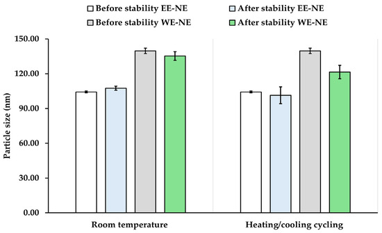Figure 9. The particle size and viscosity of both the NE-EE and NE-WE formulations did not change significantly after undergoing six cycles of heating and cooling and room temperature for 21 days (