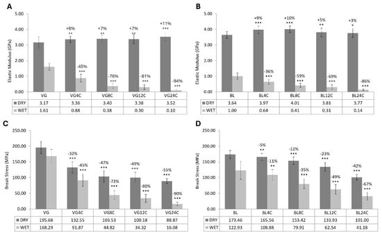 | Group | Elastic Modulus (GPa) | Break Stress (MPa) | ||||