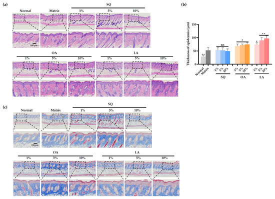 The skin of mice after 6 weeks of UV modeling was selected for section staining and pathological observation. The results are shown in Figure 2a,c. Compared with the normal group, the epidermal cell structure in the matrix group was altered, exhibiting disorganized cell arrangement, increased stratum corneum thickness, and epidermal hyperplasia. Although stratum corneum thickening and epidermal hyperplasia were also observed in the squalane group, no significant differences were detected compared to the matrix group (Figure 2b). In the UV-induced skin damage experiment, the experimental results of polydimethylsiloxane (PDMS) were consistent with those of squalane. Specifically, PDMS (1%, 5%, 10%) showed no exacerbation of UV-induced skin damage in appearance (Figure S1a), but histological analysis revealed stratum corneum thickening and epidermal hyperplasia (Figure S1b). However, epidermal thickness remained statistically similar to the matrix group (Figure S1c). In contrast, stratum corneum thickening was more pronounced in the oleic acid (OA) and linoleic acid (LA) groups, accompanied by stratum corneum cell proliferation, relative to the matrix group. Both the 5% and 10% LA groups significantly promoted epidermal hyperplasia (p < 0.01). Additionally, OA and LA induced follicular obstruction, with severity escalating at higher concentrations. These treatments also disrupted lipid metabolism. Notably, 10% LA group exhibited severe atrophy of the sebaceous glands.