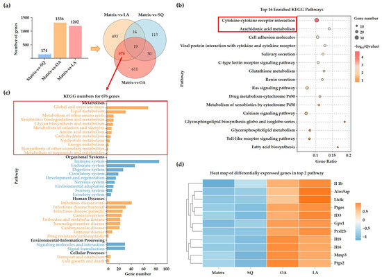 Transcriptome analysis of the effects of 10% SQ, OA, and LA on the skin of ultraviolet-irradiated mice. (a) Number of differential genes and Wayne’s diagram display in SQ, OA, LA vs. matrix group. (b) Statistical chart of KEGG numbers for 676 genes. Key enriched pathways are highlighted (red box). (c) KEGG-enriched significant bubble plots for 676 genes. The metabolism pathway is marked with a red box. (d) Heatmap of differential genes in the cytokine–cytokine receptor interaction and Arachidonic acid metabolism pathways.