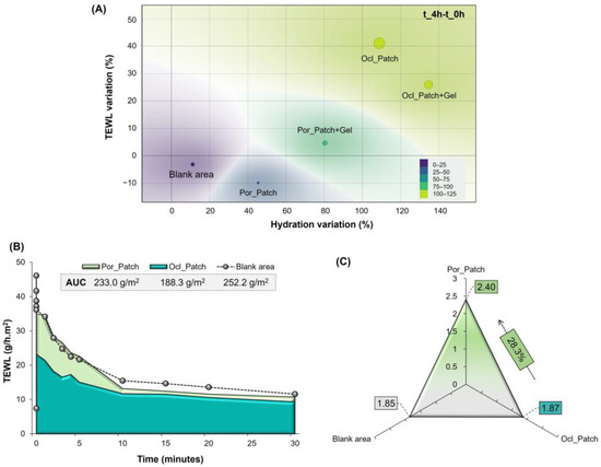 The hydration-TEWL performance mapping is displayed in Figure 1A. Specifically, the hydration data indicates that, under no-occlusion conditions, the Ocl_Patch increased moisture content by 108.85%, whereas the Por_Patch exhibited an increase of 45.38%. The application of a gel beneath the patches increased hydration performance, independently of patch design. This enhancement may be attributed not only to the application of the gel, but also to the inherent capacity of the patches to undergo a certain degree of swelling under such conditions.