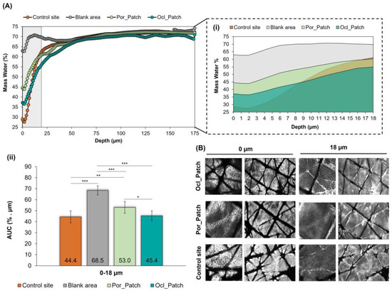 Impact of patch design on hydration performance—Advanced methods. (A) Hydration performance analyzed by Confocal Raman Spectroscopy. (A,i) Water mass profiles from 0 to 18 µm, corresponding to the mean stratum corneum thickness of the selected volunteers. (A,ii) AUC values extracted from (A,i) profiles and presented as % . µm. (B) Reflectance Confocal Microscopy images showing stratum corneum depth, after 24-h POST occlusion, recorded from a single volunteer (n = 1). Data sets with significant differences are identified with * p < 0.05, ** p < 0.01 and *** p < 0.001. AUC, Area Under Curve; Ocl, Occlusive; Por, Porous; POST, Plastic Occlusion Stress Test.