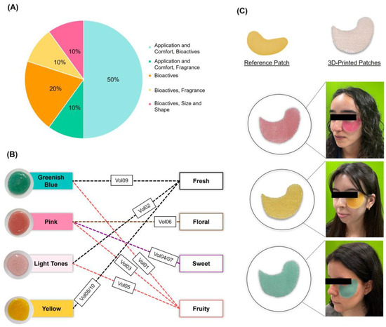 Another desirable feature of personalized skincare under-eye patches is that they cater to consumer preferences (Figure 5). In this context, implementing co-creation strategies that actively engage potential users in the development process can promote a user-centered design framework, enhancing the likelihood that resulting products will be both functionally effective and emotionally captivating. To gain insights into users’ application goals, skincare needs, and fragrance and color preferences, a questionnaire was applied. The results revealed that the primary concerns among volunteers were skin hydration, enhanced appearance, and overall aesthetic satisfaction (Appendix A, Table A1). Furthermore, participants were asked to identify the most important elements they would consider when designing their own patches. As shown in the pie chart (Figure 5A), 50% of respondents prioritized the inclusion of bioactives, alongside considerations for application and comfort. Concerning visual and sensory preferences, greenish blue, pink, yellow, and light shades were the most favored colors, while fragrance choices were primarily fresh, floral, sweet, and fruity (Figure 5B). Based on these findings, the under-eye patches were personalized by incorporating a moisturizer to meet the volunteers’ skincare goals and 3D-printed in their preferred colors and fragrances (Figure 5C).