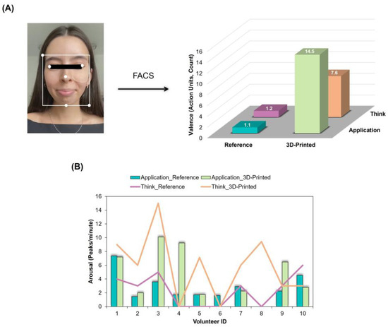 Assessment of emotional responses (Reference vs. 3D-Printed): From valence to arousal affective analysis. (A) Facial action classification system (FACS): valence data obtained during application and post-application (think). (B) Arousal rate per volunteer: Galvanic skin response (GRS) data monitored during application and post-application (think).