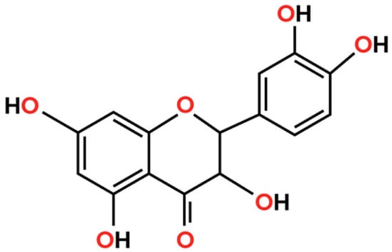 Quercetin dihydrate (≥95%) (Figure 1), lactic acid, citric acid monohydrate, ethanol (≥99.5%), acetic acid, sodium hydroxide, formic acid, Mueller–Hinton broth, nutrient agar, resazurin, and all solvents used in this study were of analytical grade and obtained from Sigma-Aldrich (St. Louis, MO, USA). Chitosan (medium molecular weight, degree of deacetylation ≥ 90%) was provided by Chitelix S.A. (Bizerte, Tunisia) and used as received without further purification. Xanthan gum (pharmaceutical grade, Sigma-Aldrich, St. Louis, MO, USA) was employed as the gelling agent in hydrogel preparation. Cosgard® (a commercial preservative composed of phenoxyethanol and ethylhexylglycerin) was obtained from Aroma-Zone (Lyon, France).