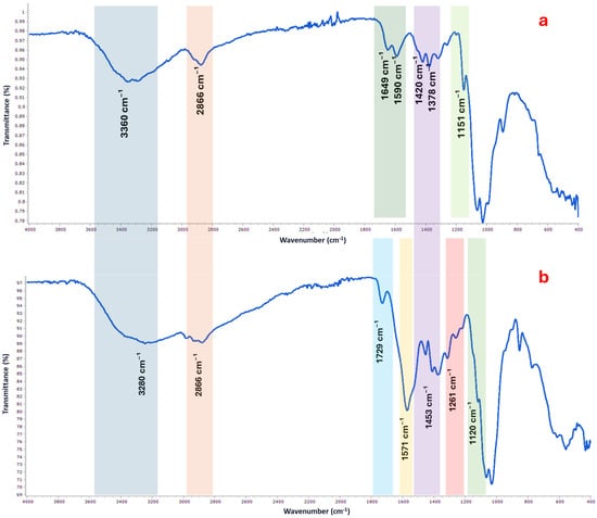 FTIR spectrum of chitosan (a) and chitosan lactate (b) showing characteristic absorption bands of functional groups.