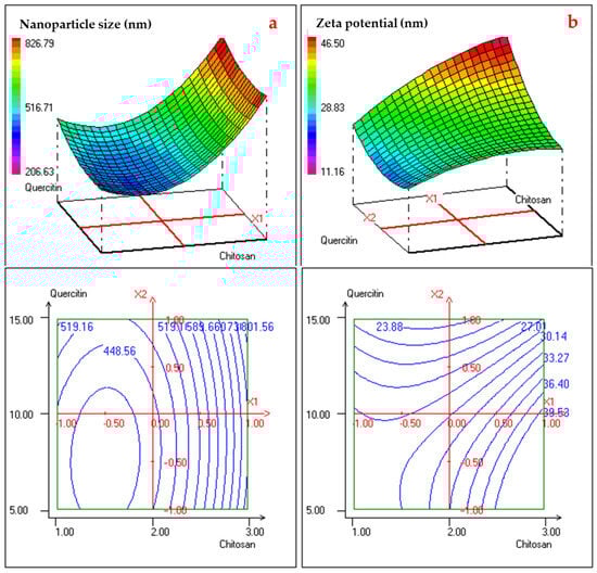 Dynamic light scattering (DLS) was employed to assess the hydrodynamic diameter and zeta potential of the nanoparticles using a Zetasizer Nano ZS (Malvern Instrument Grovewood, UK). Prior to measurement, samples were diluted at a ratio of 1:10 in deionized water to minimize multiple scattering effects. Measurements were performed at 25 °C with a fixed backscattering angle of 173°. Zeta potential values were calculated from the electrophoretic mobility using the Smoluchowski approximation. Subsequently, a response surface model was established to optimize two critical quality attributes: nanoparticle size (Ysize, in nm) and zeta potential (Yzeta, in mV), both of which are key indicators of colloidal stability and functional performance in biological applications. The design allowed a systematic evaluation of formulation variables and facilitated the identification of optimal synthesis conditions for the quercetin-loaded chitosan lactate nanoparticles The model was constructed to optimize two dependent responses: nanoparticle size (Ysize, in nm) and zeta potential (Yzeta, in mV), which are critical parameters for assessing colloidal stability and biological performance. This design enabled an efficient exploration of the formulation space and facilitated the identification of optimal conditions for nanoparticle synthesis.